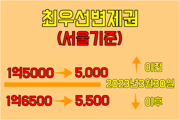 서울기준 최우선변제권은 2023년3월30일 이전은 보증금이 1억5천이하시 5천만원까지,