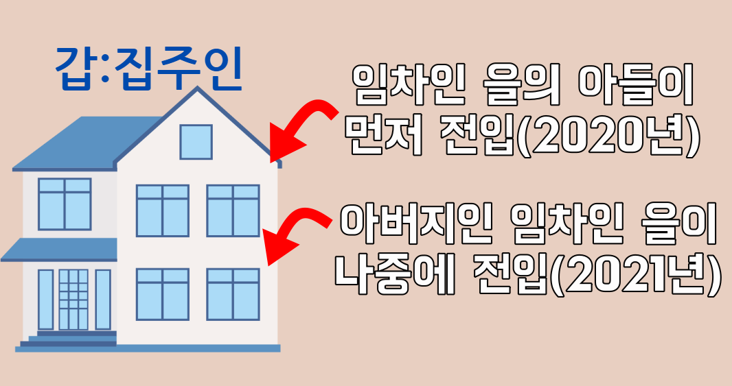 임차인인 을의 아들이 먼저들어와 살고 나중에 아버지가 들어와 전입신고를 해서 아버지가 세대주가 됐다면 이것또한 세대합가가되서 전입한 날짜는 아버지 기준이 아니라 아들이 전입한 날짜 즉 2020년이 되는겁니다.