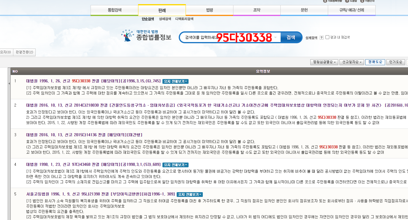 "세대합가"대법원판례에 대한내용은 "대한민국 법원 종합법률정보" 홈페이지에 들어가서 메인화면 "판례"에 들어가서 "단순검색"클릭후 "95다30338"을 검색하시면 세대합가에대한 판례내용을 보실 수 있습니다.