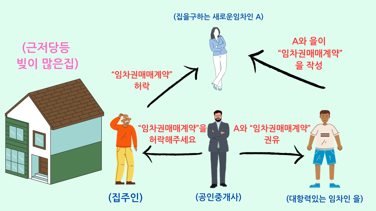 공인중개사가 A에게 을이 가지고있는 대항력을 물려받을 수있다고 이야기합니다. 그 방법은 을과 새로운임차인 A가 "임차권매매계약"을 맺으면 된다고 하면서 말입니다. 여기에 집주인의 동의만 있으면 됩니다.