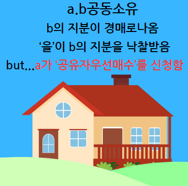 예를들어 한 건물을 a와b가 공동으로 가지고 있는데 b의 지분만 경매로 나왔을때 b의 지분 감정가 1억을 을이라는 사람이 1억2천에 낙찰받았는데 b와 공동건물주인 a가 1억2천에 낙찰받을 의사가 있다면 최고가매수인의 권리를 뺏어올수 있습니다. 즉 지분권자가 최고가매수인으로 바뀌는 겁니다.