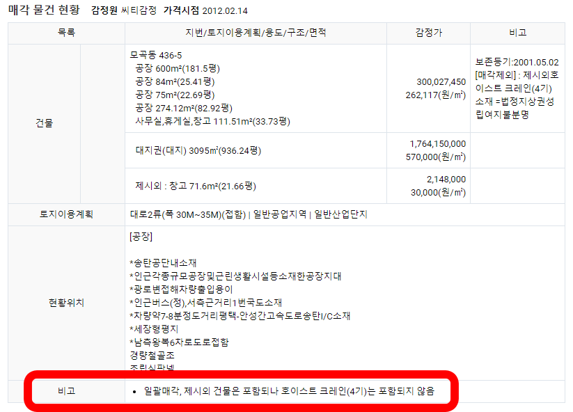 비고란을보니 호이스트가 매각물건에 포함이 안되어 있습니다.