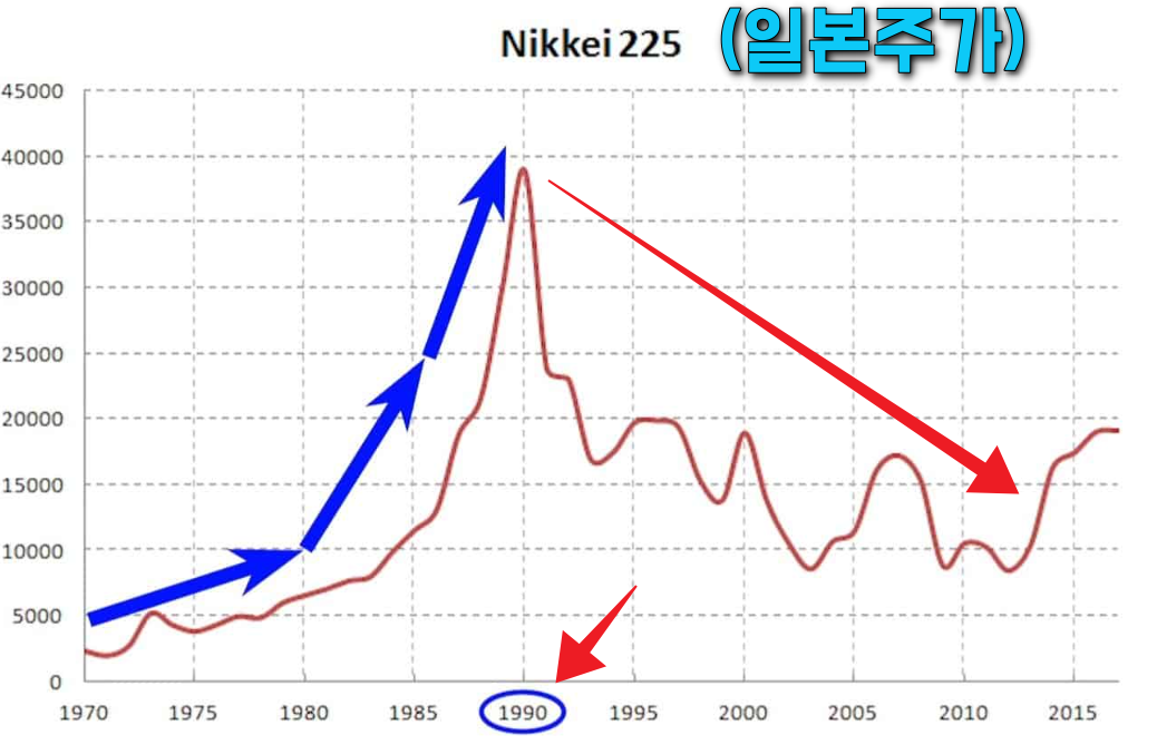 일본은 1990년도에 버블이 꺼지고 불황을 겪게됩니다.