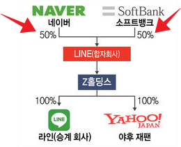 라인야후는 네이버와 손정의의 소프트뱅크라는 회사가 50대50으로 합작투자해서 만든회사입니다.