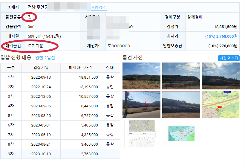 예를들어 위와같은 토지 지분물건이 나왔다고 해볼께요. 물건종류는 전이구요.