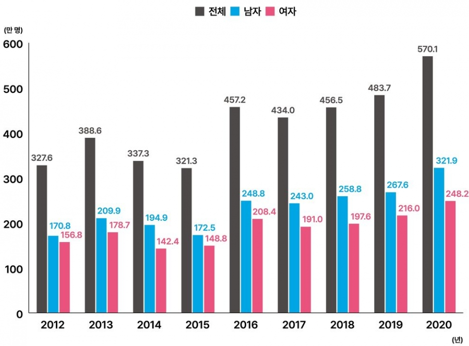 남성은 30대때 135만명정도가 당뇨병으로 고생을 했는데 여자보다 좀더 젊은시기에 당뇨병이 찾아오는것으로 나타났습니다. 여성은 50대 폐경이후에 급격히 당뇨병이 찾아오는것을 볼수가 있는데요. 환자수에서 50대이후부터는 여성이 남성을 추월했습니다.