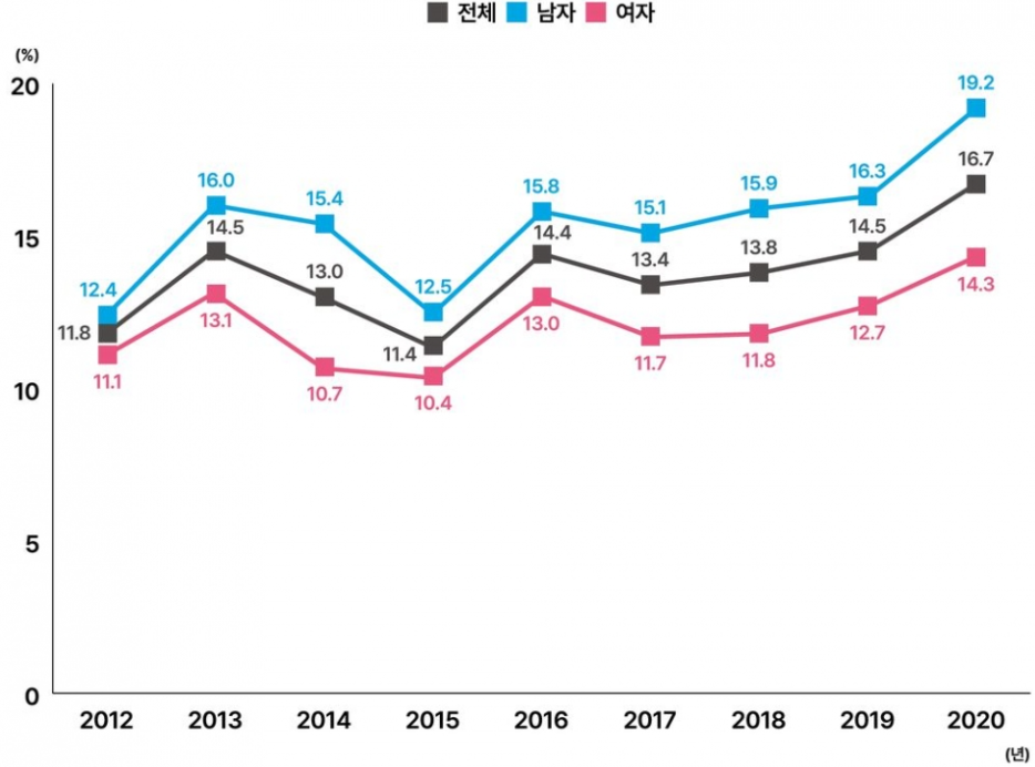 2020년 65세 인구중 당뇨병 환자수는 30%를 넘어섰고 남자가 19.2%,여자가 14.3%로 남자의 당뇨병 유병률이 여성보다 더 높았습니다. 최근 9년간 당뇨병유병률도 2015년도에 11.4%로 잠깐 줄어들었으나 꾸준히 증가하는 추세입니다.