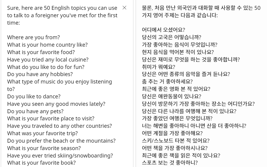 그 다음에 chat gpt로가서 "Please make me 50 English contents to talk to a foreigner I met for the first time."이 영어문장을 검색했더니 아래의 문장 50개를 만들어 줬습니다.