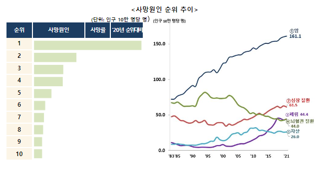 통계청에서 발표한 2021년 사망원인 통계에 따르면 우리나라 사망원인 1위는 역시 악성신생물,암입니다.
