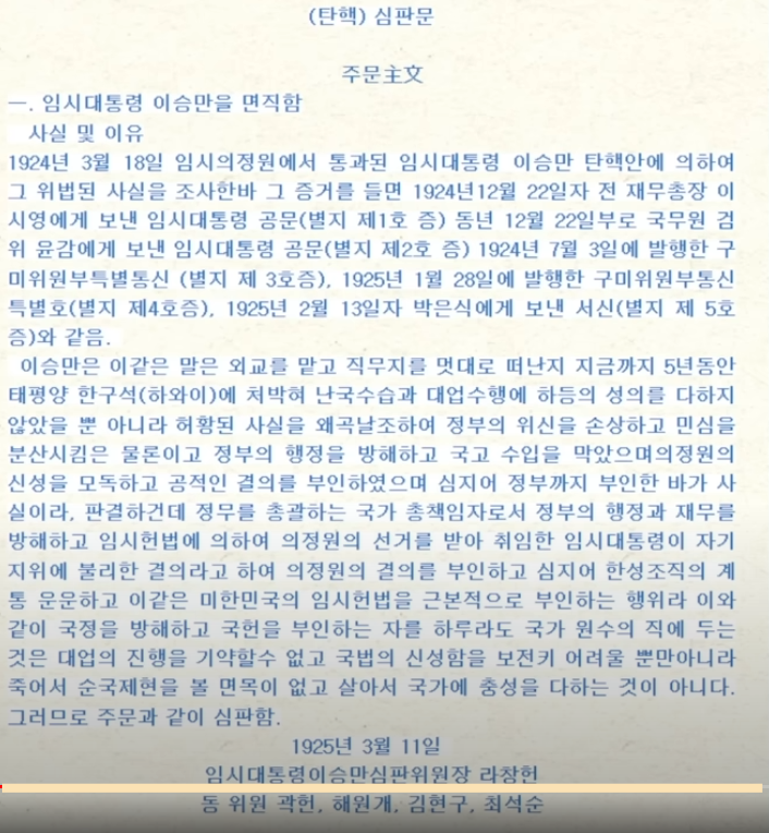 힘을합해도 부족한판에 조선인을 분열시키고 이런 식의 행동을하니 1924년도에 이를 지켜볼수없었던 곽헌등의 임시정부 사람들이 이승만 탄핵문을 낭독하고 이승만을 탄핵시킵니다.