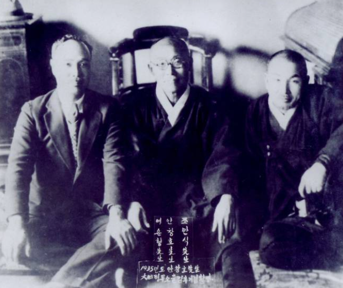 38년도 3월10일 돌아가시기전 마지막 사진이 몽양여운영, 고당조만식 선생하고 찍은 쓰리샷입니다.