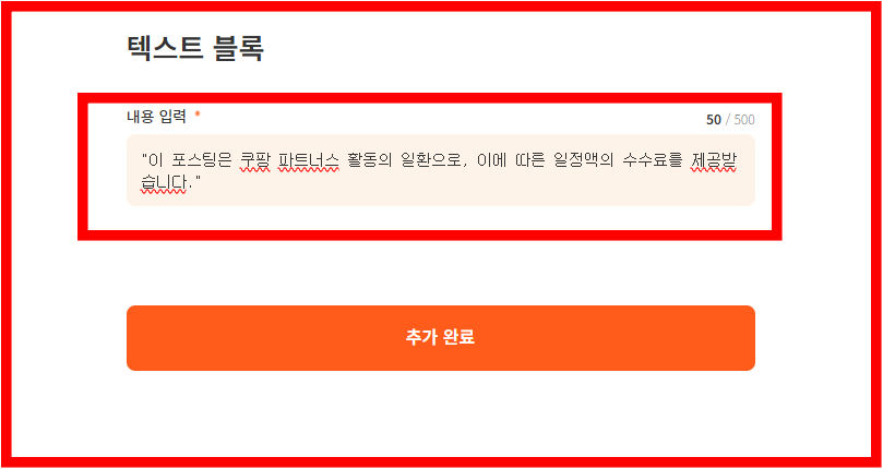 이와 같이 텍스트창이 생기면 여기에 위와 같이 " 이 포스팅은 쿠팡 파트너스~~"의 내용을