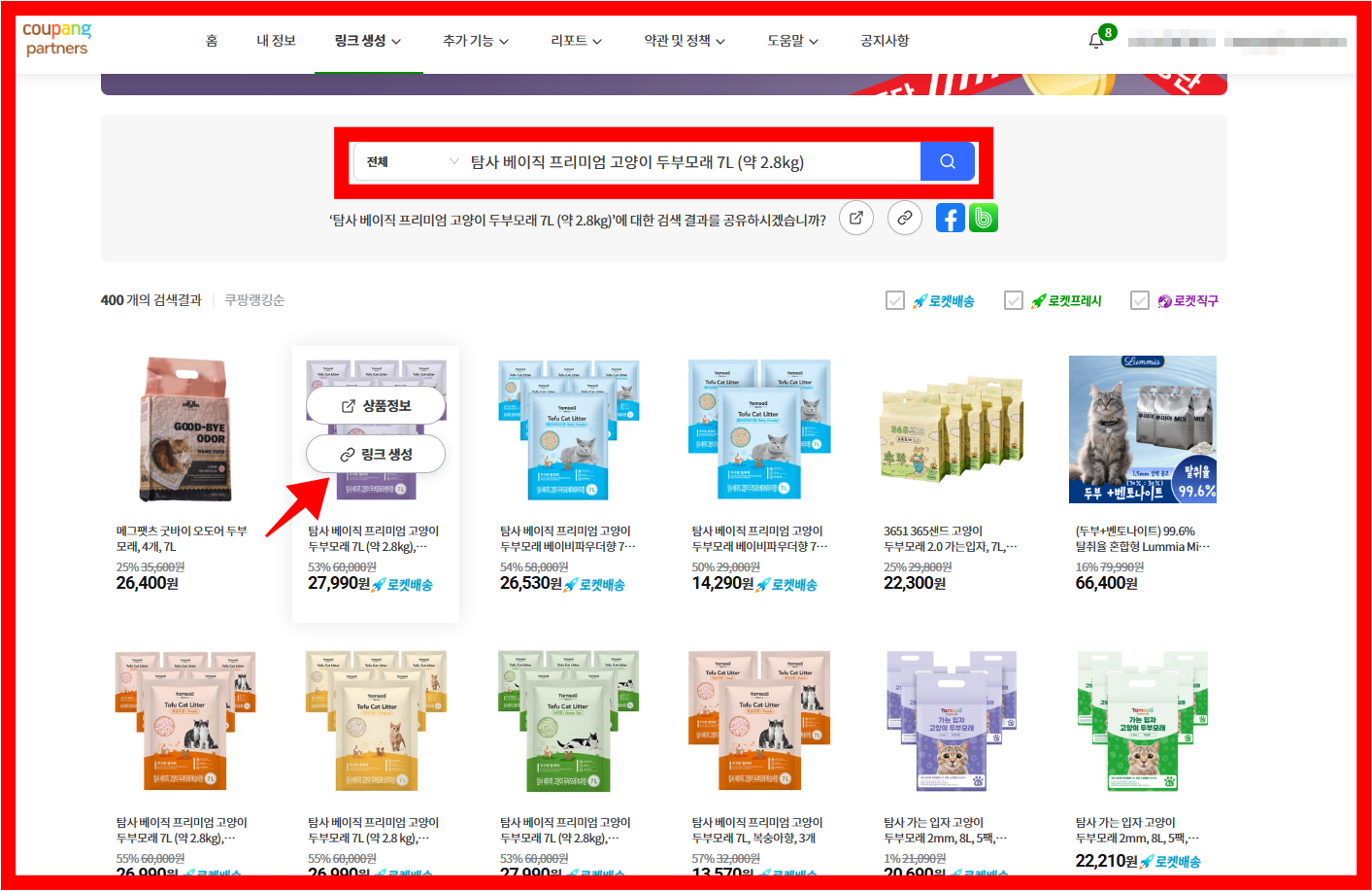 그랬더니 여러가지 제품이 뜨고 제가 원하는 제품에 마우스를 갔다되면 '상품정보'와 링크생성'이란 메뉴가