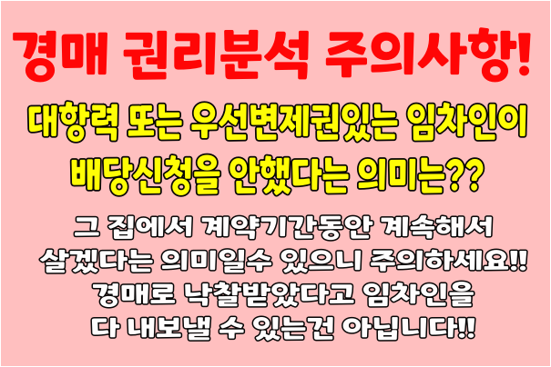 또한 임차인이 대항력과 우선변제권이 있는데 배당요구를 안했다는건 낙찰자가 임차인의 보증금을 물어줘야하지만 반대로 임차인이 보증금을 안받고 그 집에서 계속 살겠다는 의미일 수 있습니다.이점 꼭 주의하세요!!