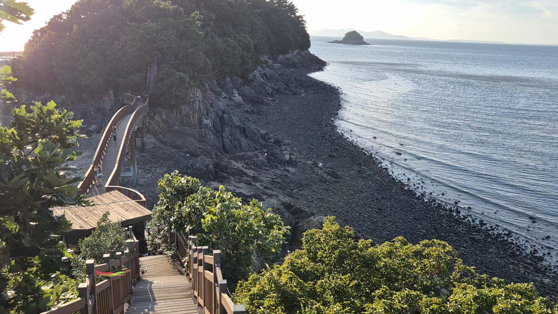 ● 다양한 길(흙길, 데크길, 짚길)을 지나 해안 데크길과 절벽 풍경이 이어지며, 마침내 낙조전망대에 도착했습니다.