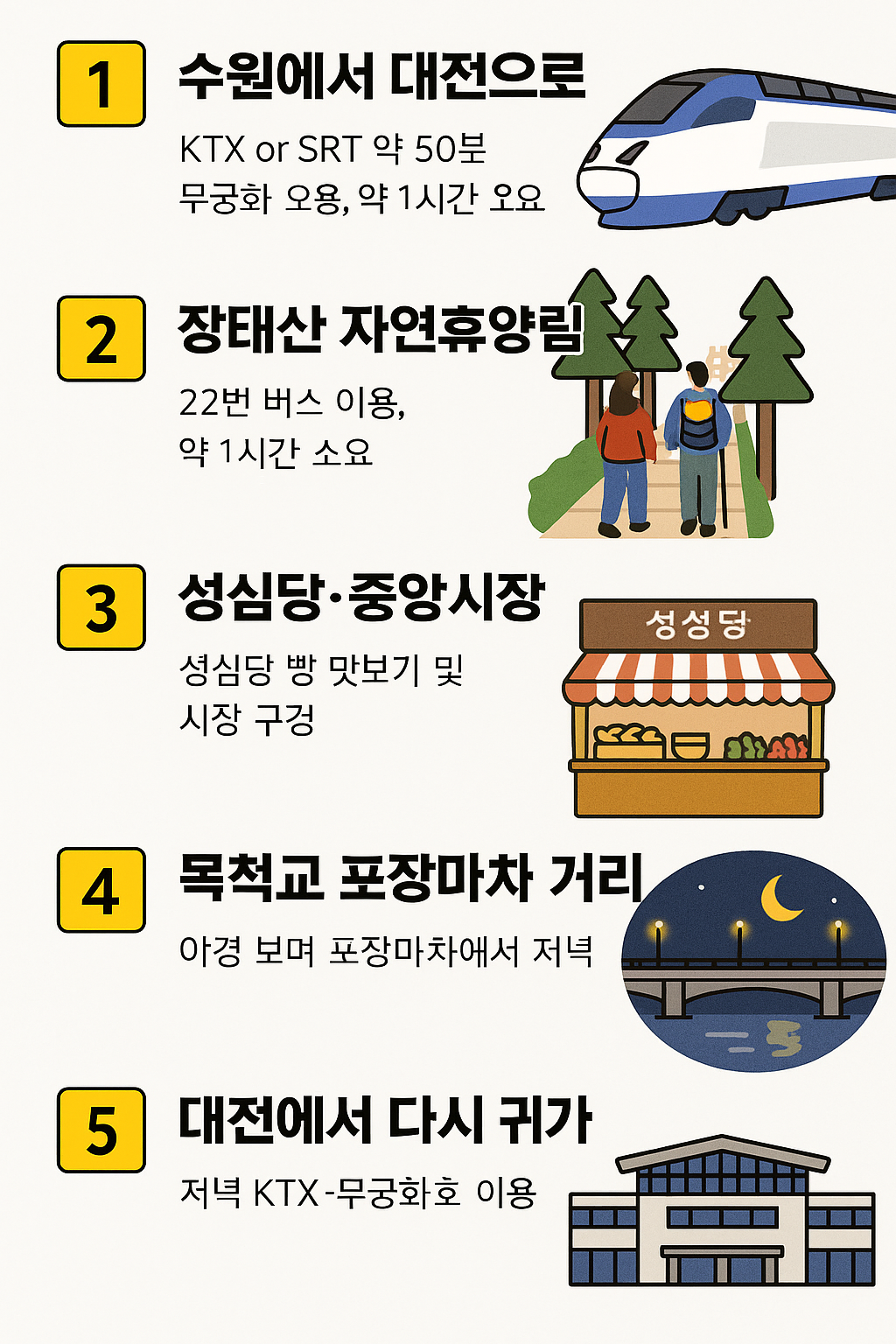 수원역 출발 → 대전역 도착 → 장태산 자연휴양림 → 성심당 → 대전 중앙시장 → 목척교 포장마차 거리 → 대전역 귀환 → 수원역 도착